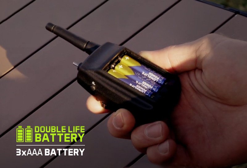 Set wird mit 9-V-Batterien betrieben. Wenn diese schwach sind, werden Sie vom Bissanzeiger und vom Empfänger mit einem kurzen Piepton benachrichtigt. Im Packet erhalten Sie der Ständer für Empfänger so wie eine Schutzhülle für Bissanzeiger.