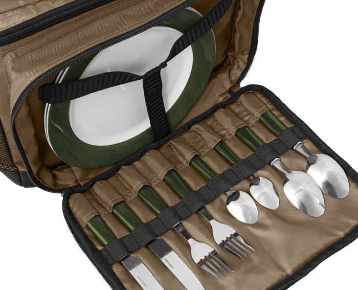 Auf der Vorderseite befindet sich eine große Tasche, in der ein komplettes Essensset für zwei Personen an einem Ort untergebracht ist. Es enthält zwei Teller aus Kunststoff, zwei Messer, zwei Gabeln, zwei Löffel und zwei kleine Dessertlöffel. Von nun an können Sie mehr Komfort genießen, auch wenn Sie mit Ihrer Frau oder Ihrem Angelpartner im Freien sind!