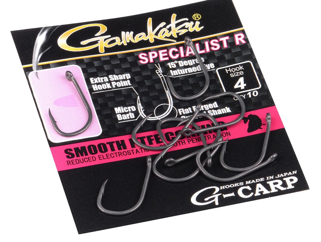 Gamakatsu Spezialist „R“#8 – Ein spezieller „Claw-Hook“, der dank ultradünner und superscharfer Hakenspitze sowie dem in 15 Grad nach innen abgewinkeltem Hakenöhr beste Hakeigenschaften biete. Der große Hakenbogen des Gamakatsu Spezialist ‚R Hakens hält unter erhöhtem Druck besonders gut. Die nach innen gedrehte Hakenspitze bietet erhebliche Vorteile bei unebenem Untergrund. Ein Haken mit gebogener Hakenspitze bleibt länger scharf als ein Haken mit gerader Hakenspitze, denn diese ist gegen Steine und Felsen besser geschützt. Der spezielle „flach“ geschmiedete und geschwungene Hakenschenkel verleiht zusätzlich Kraft und Widerstandsfähigkeit.