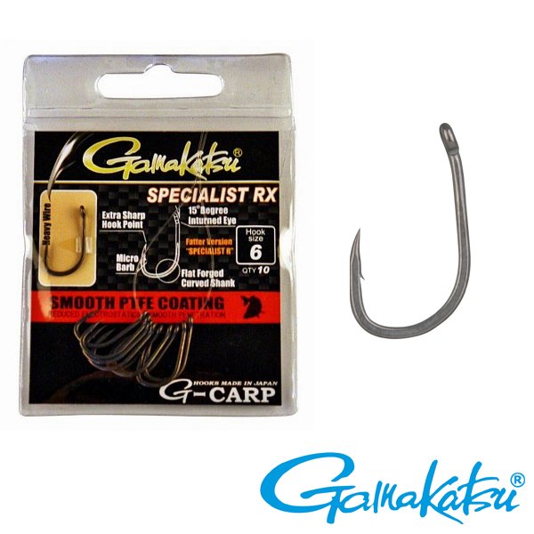Gamakatsu Spezialist „RX“#8 – Ein spezieller „Claw-Hook“, der dank ultradünner und superscharfer Hakenspitze sowie dem in 15 Grad nach innen abgewinkeltem Hakenöhr beste Hakeigenschaften biete. Der große Hakenbogen des Gamakatsu Spezialist ‚RX Hakens hält unter erhöhtem Druck besonders gut. Die nach innen gedrehte Hakenspitze bietet erhebliche Vorteile bei unebenem Untergrund. Ein Haken mit gebogener Hakenspitze bleibt länger scharf als ein Haken mit gerader Hakenspitze, denn diese ist gegen Steine und Felsen besser geschützt. Der spezielle „flach“ geschmiedete und geschwungene Hakenschenkel verleiht zusätzlich Kraft und Widerstandsfähigkeit.